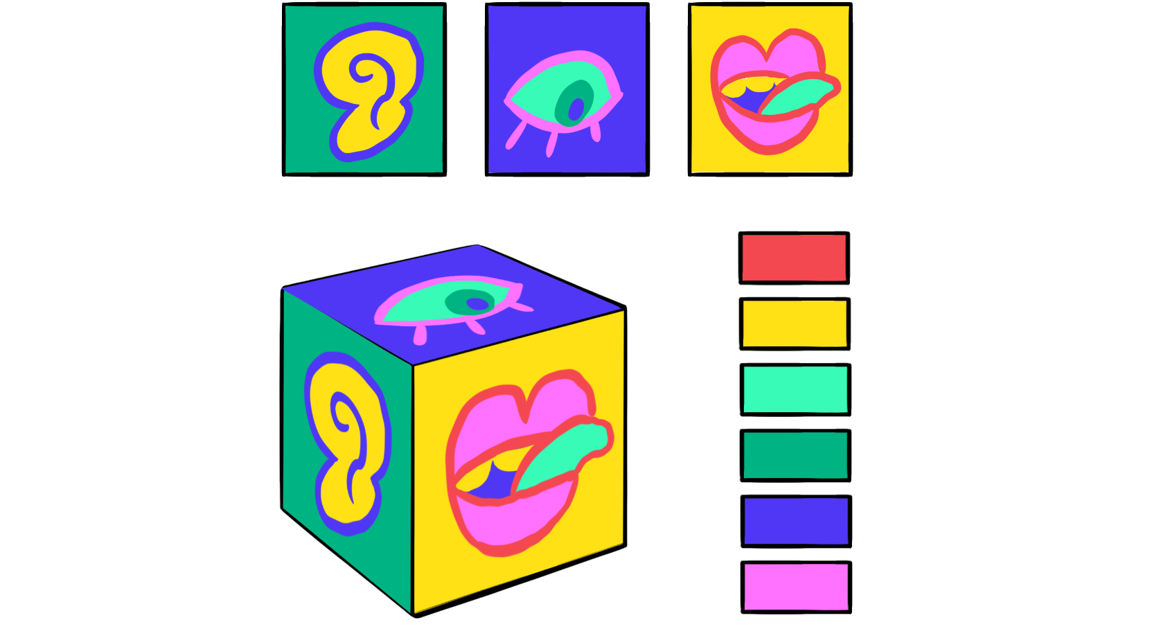 Projecting animations onto a cubeĀ presented me with the unique challenge of designing 3 GIFS that worked together to tell a story while still standing out and serving their own purpose. I took 3 facial features and determined how they would interact with one another in a 3D environment.