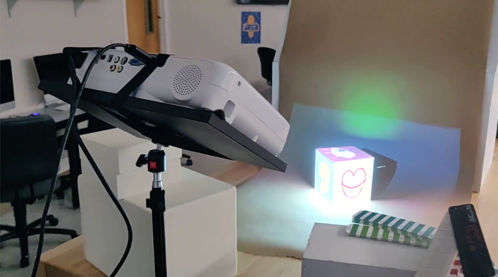 I used 6 colors total, with each one appearing on 2 sides to keep the piece unified andĀ each side having a different dominant color to create contrast. Each GIF was projected onto the cube using Millumin.